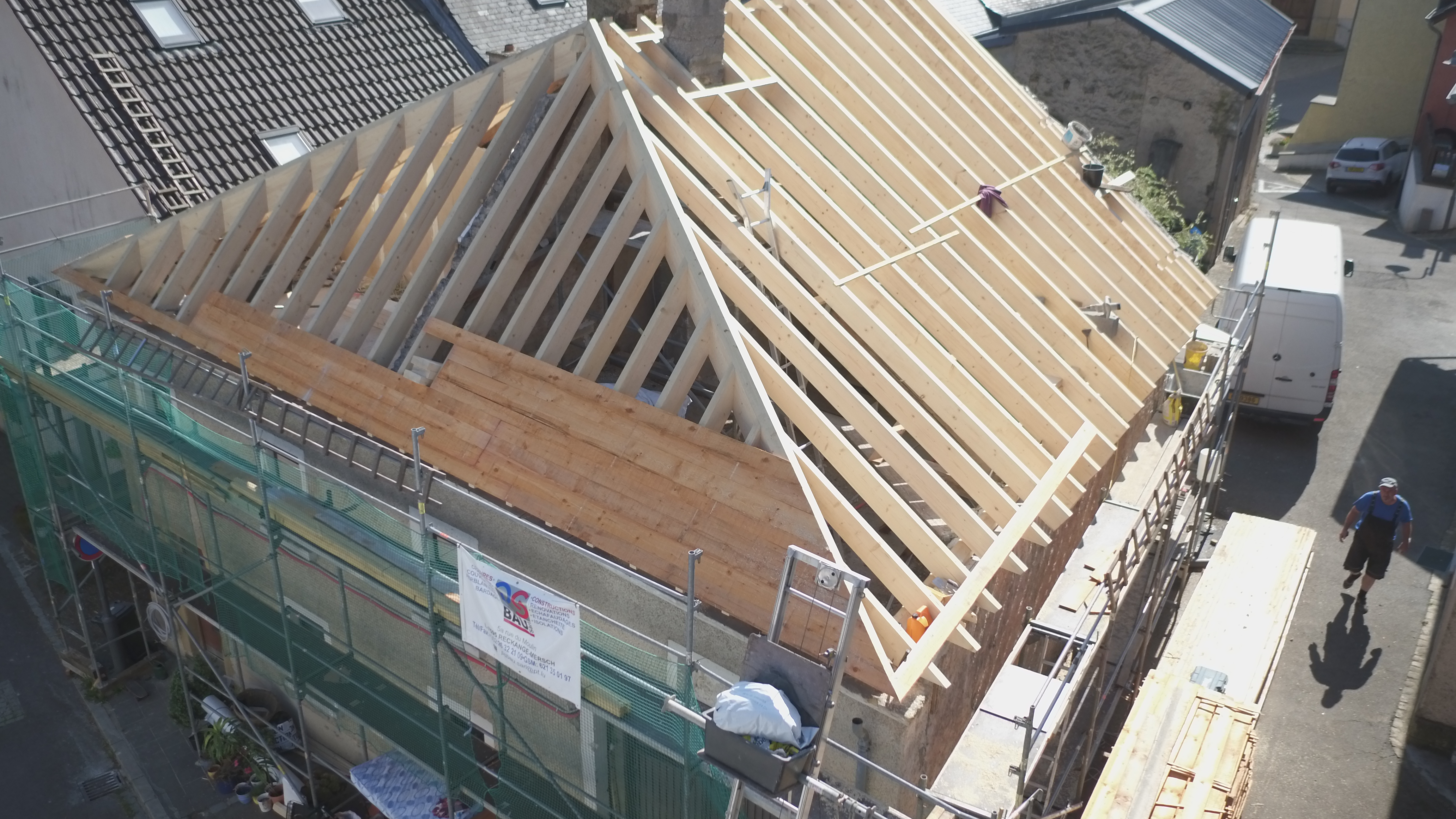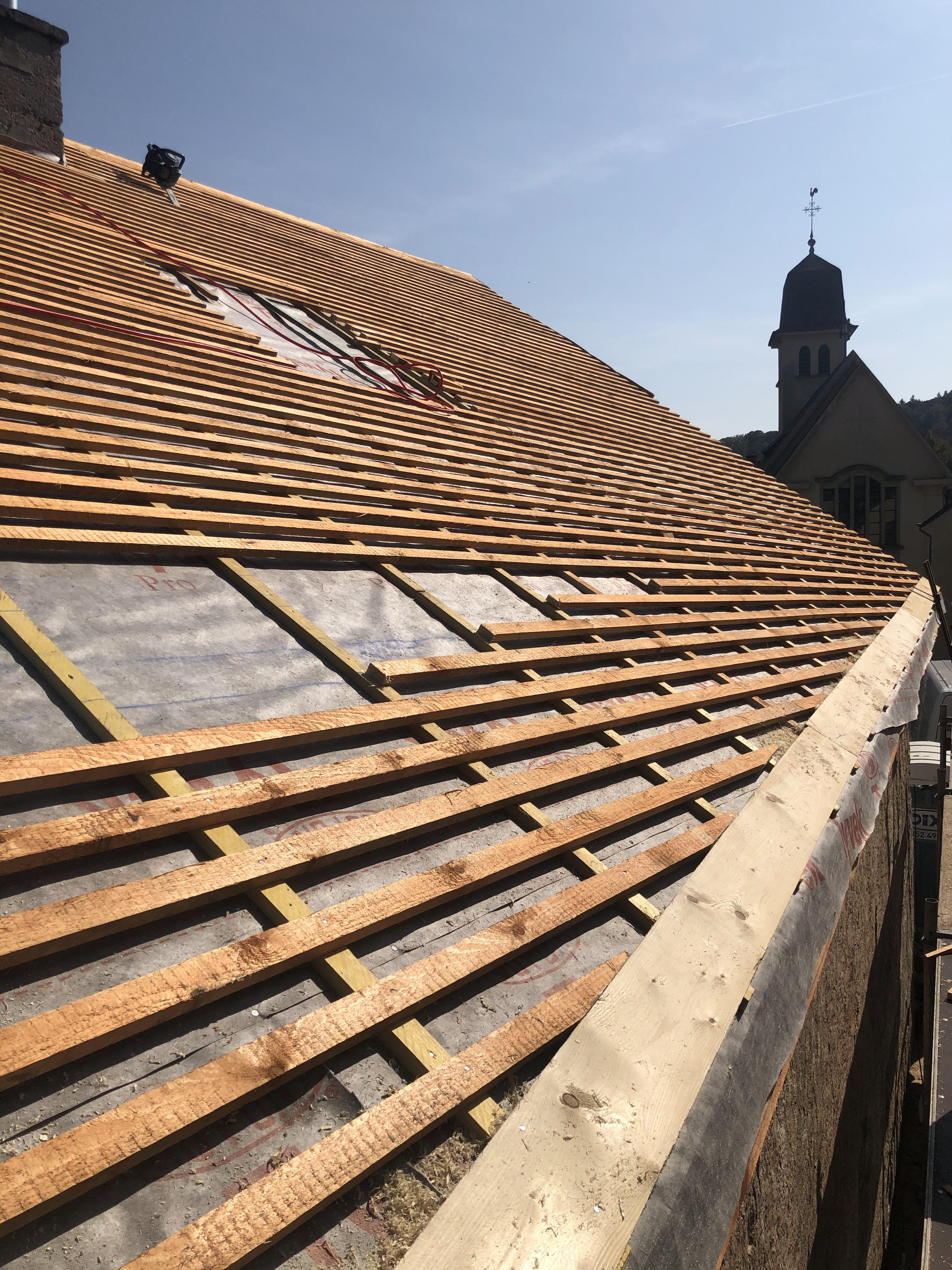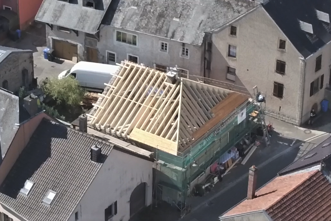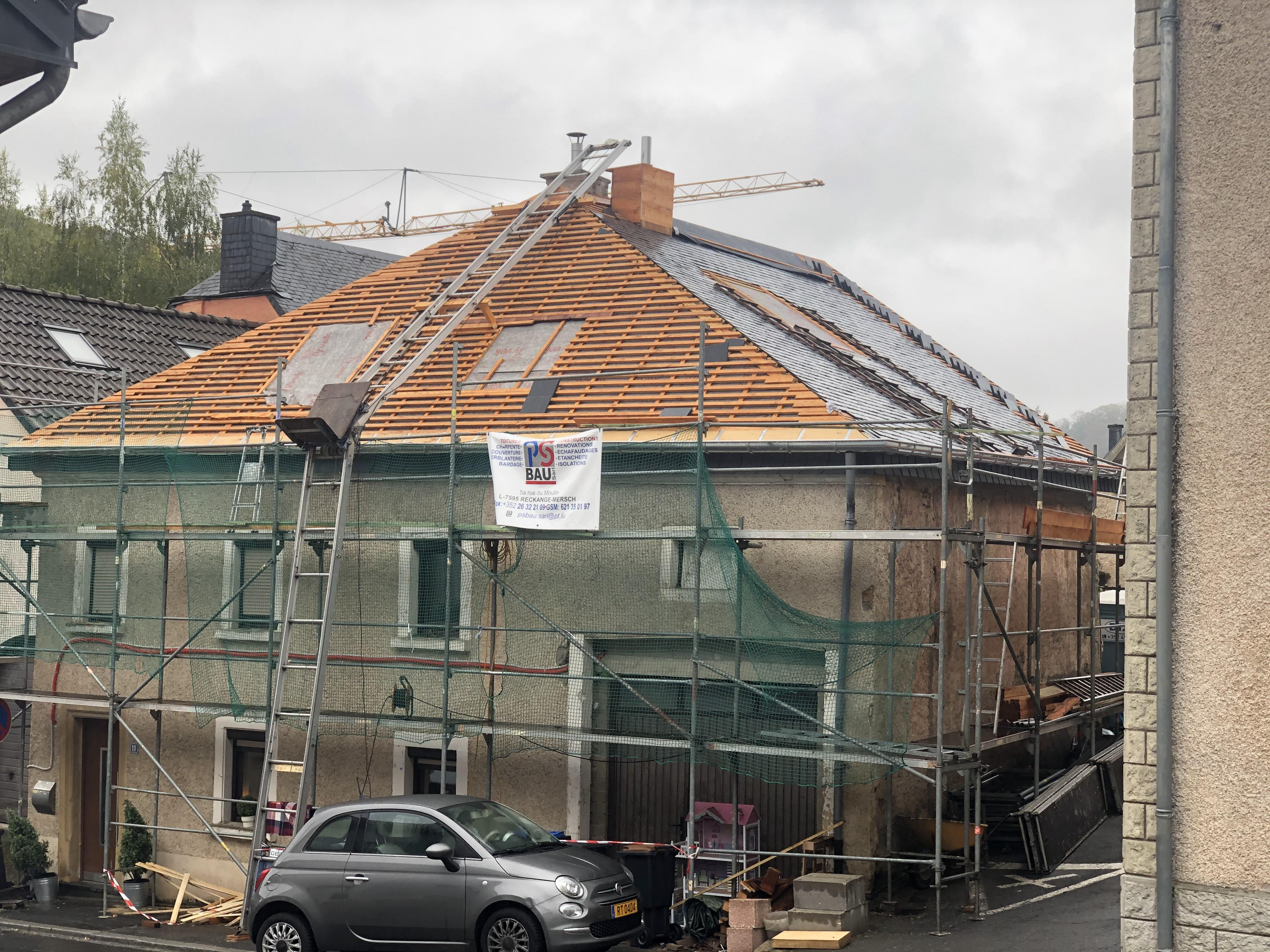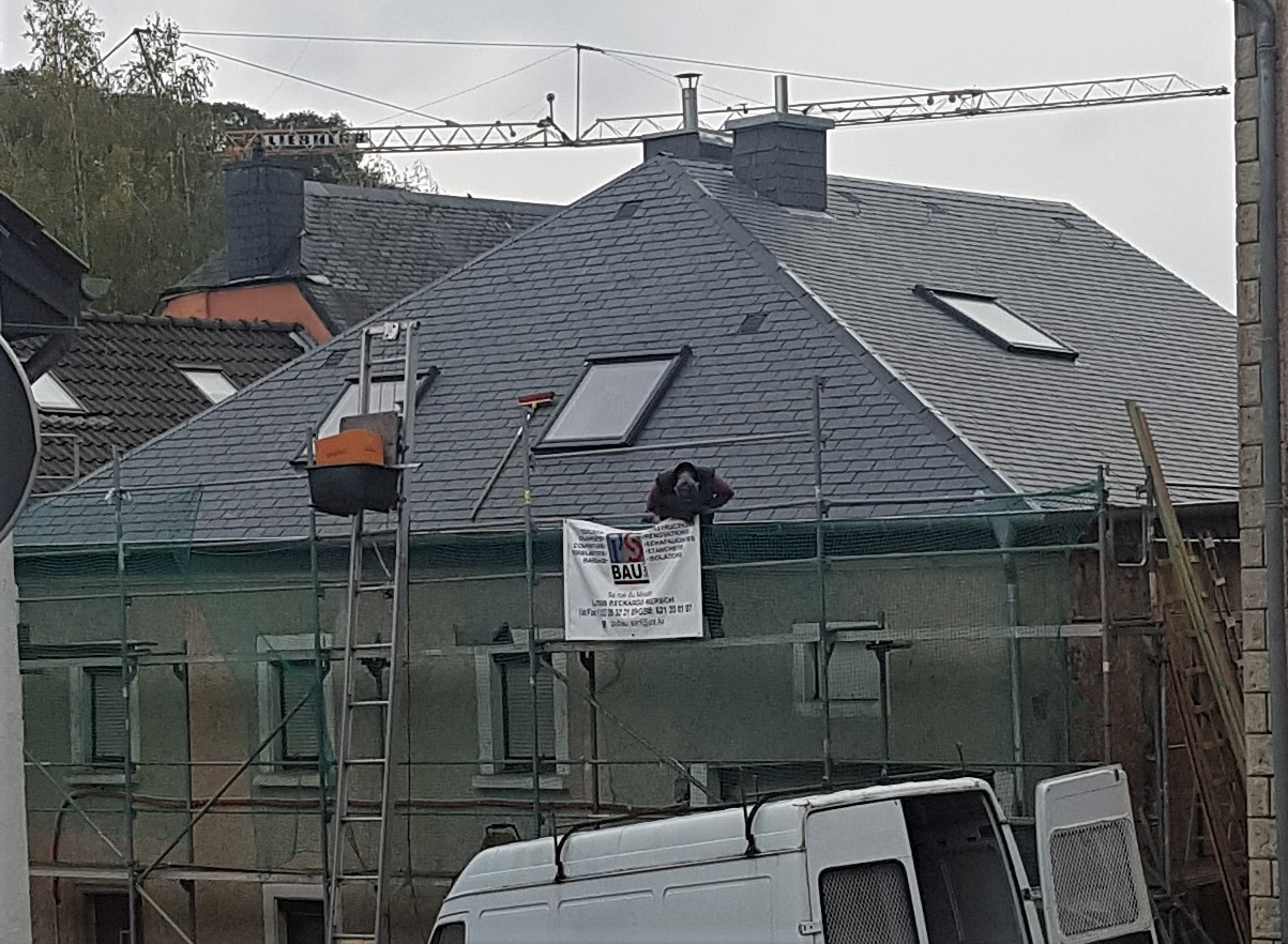 Bau eines neuen Dachs in Bettendorf. Die Deckung wurde in Schiefer ausgeführt und es wurden 5 Dachfenster eingebaut.