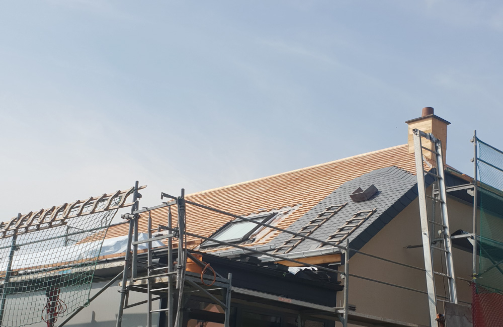 Unser erfahrenes Dachdecker-Team hat auf diesem Projekt in der Gemeinde Useldange, Luxemburg, die alte Ziegel-Dachdeckung entfernt und durch ein langlebiges Schieferdach ersetzt. Dabei wurden auch die alten Dachfenster durch moderne, solarbetriebene Modelle mit integrierten Rollläden ausgetauscht. Die Regenrinnen und Abflussrohre wurden ebenfalls erneuert, und der Kamin erhielt eine neue Verkleidung. Die neuen, solarbetriebenen Dachfenster sind energiesparend und tragen zur Reduzierung der Energiekosten bei, indem sie die Wärmeverluste im Winter und Hitze im Sommer reduzieren. Durch die Kombination aus Schieferdach und neuen Dachfenstern erhält das Gebäude nicht nur optimalen Schutz, sondern auch einen modernen, attraktiven Look und höheren Wohnkomfort.